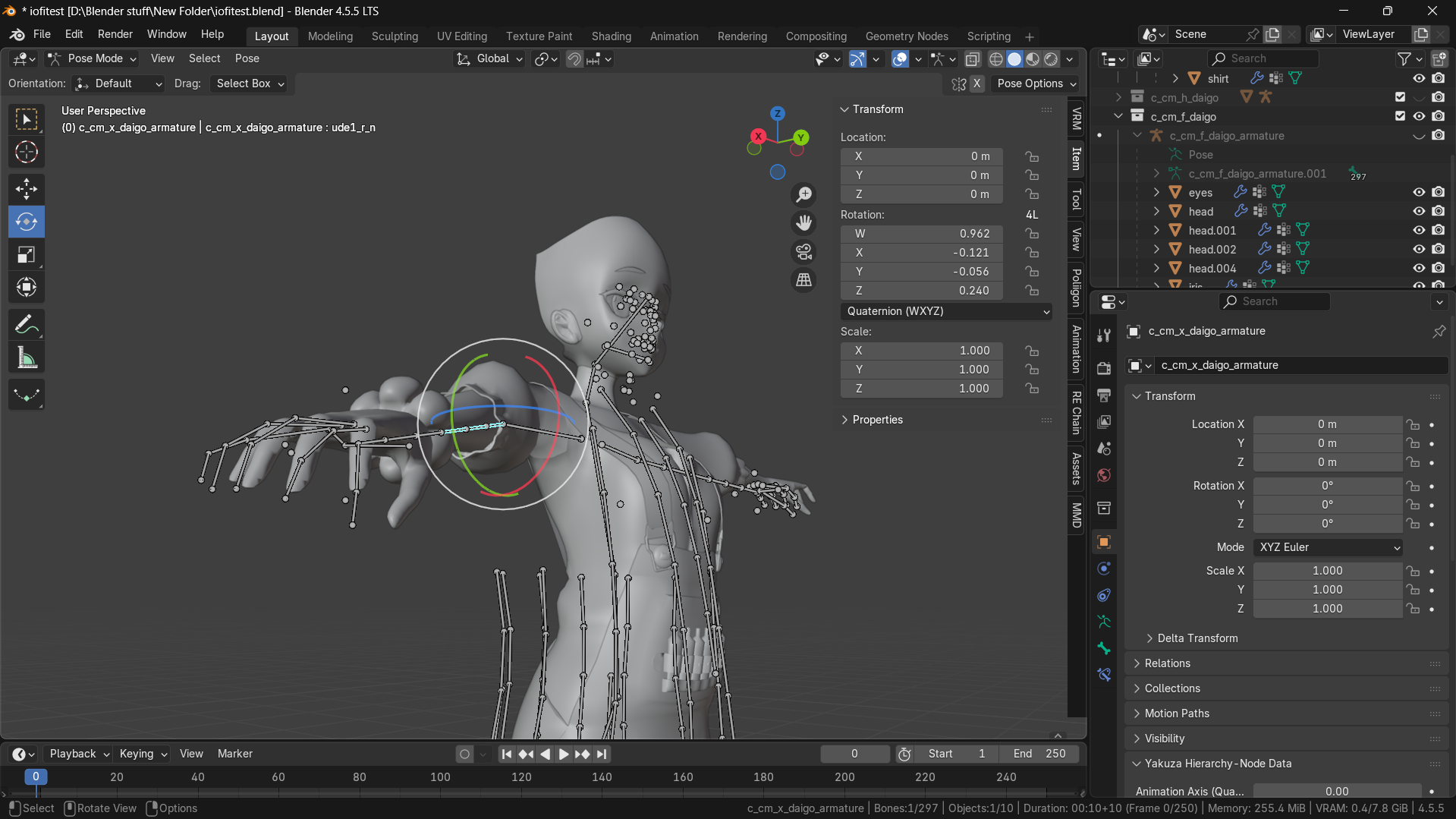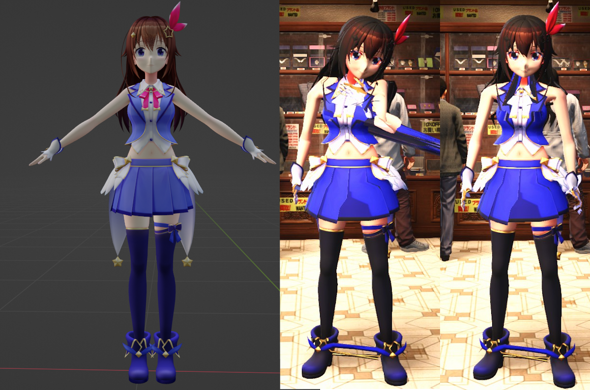I made several character replacement mods that integrates a talent from Hololive into the Yakuza / Like a Dragon series of games while maintaining animation compatibility. This was made using Blender and community made addons.